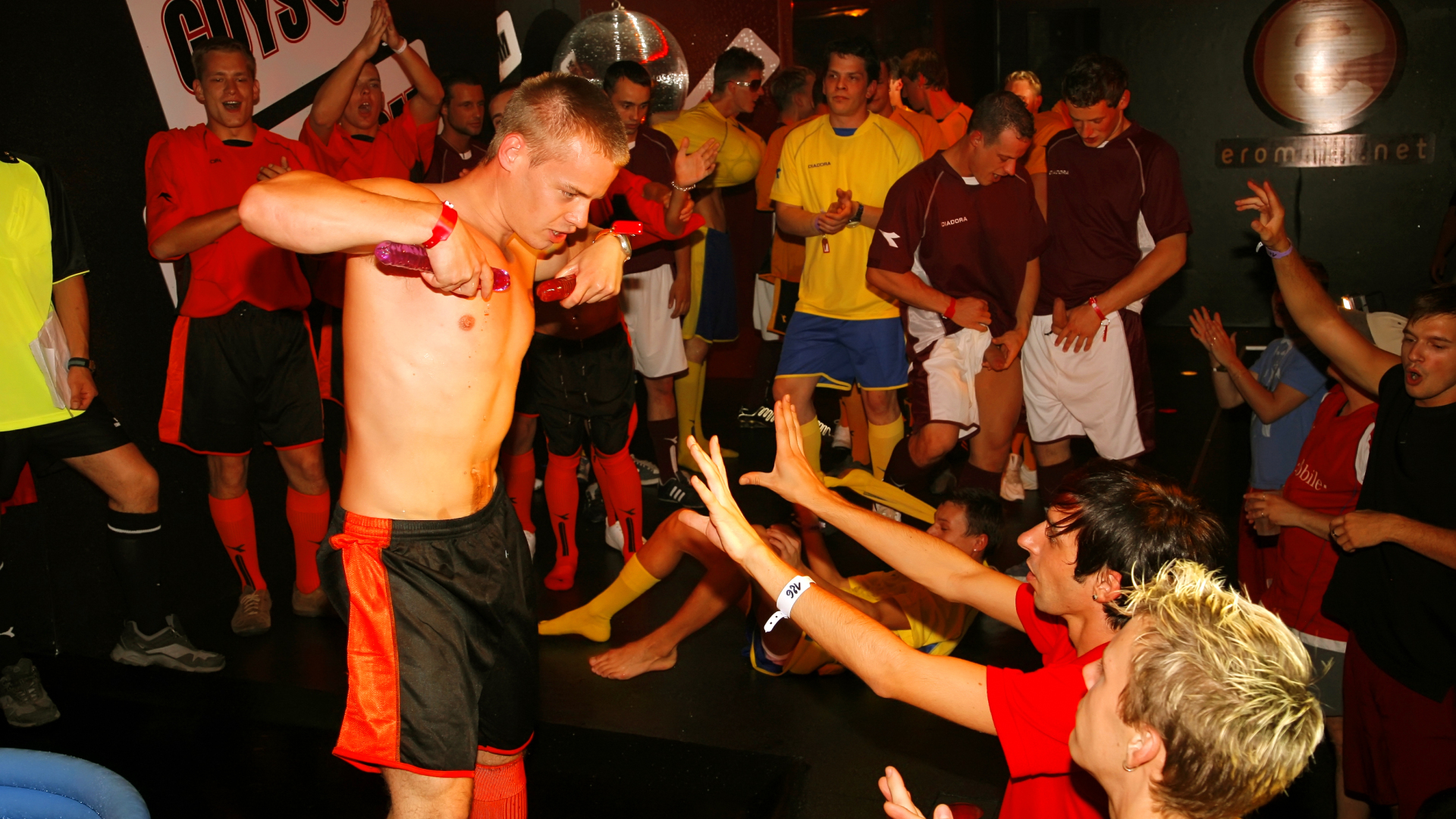 Our latest guys go crazy party is underway and a huge group of horny guys are dancing around, watching action unfold on stage! Guys on the stage are dressed in football kits and rile up the crowd with a cute twink teasing them as he waves about two giant dildos! One of the studs takes out his cock and the twink kneels down and and sucks his cock...